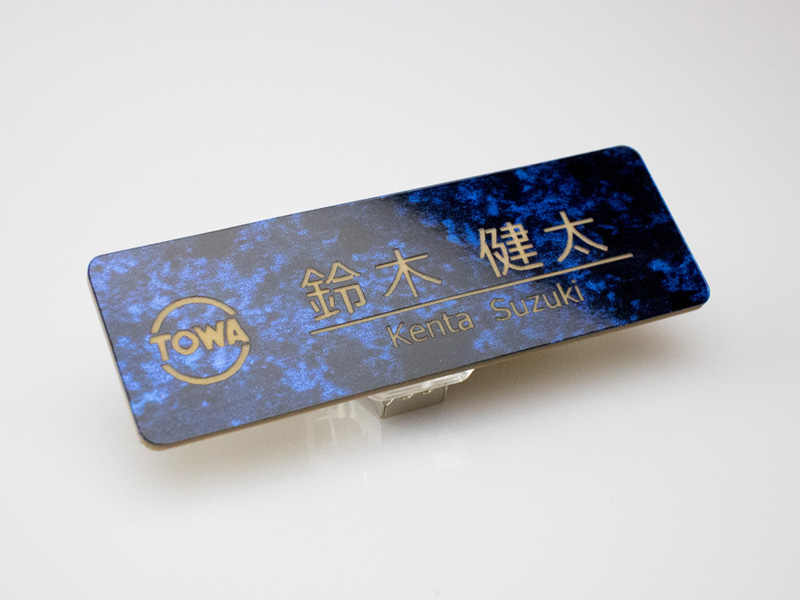 製法:レーザー彫刻 仕様:約1.5 ㎜厚。基本は彫っぱなしで色挿しを行いません。- 二層になった材料の表面をレーザー彫刻して下地の色を活かす樹脂系の材料です。レーザー彫刻名札と違い、凹んだ部分には色を挿しません。